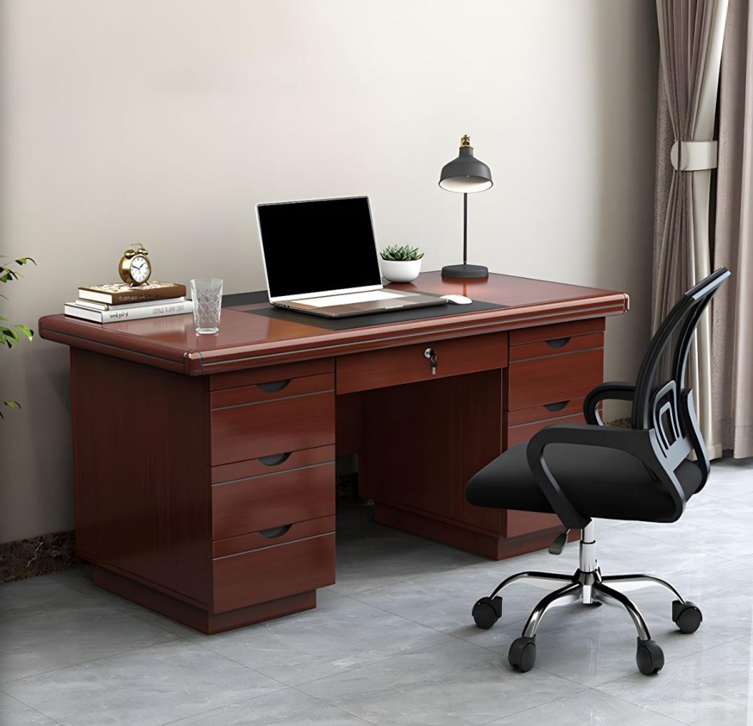 Our 1.2m executive office desk features contemporary mahogany stylesolid construction, inbuild table top leather writing pad, mobile pedestal drawers storage unit, pencil drawer on the table top, cable management holes, drawers on the right side of the desk and a swinging door on the other side.