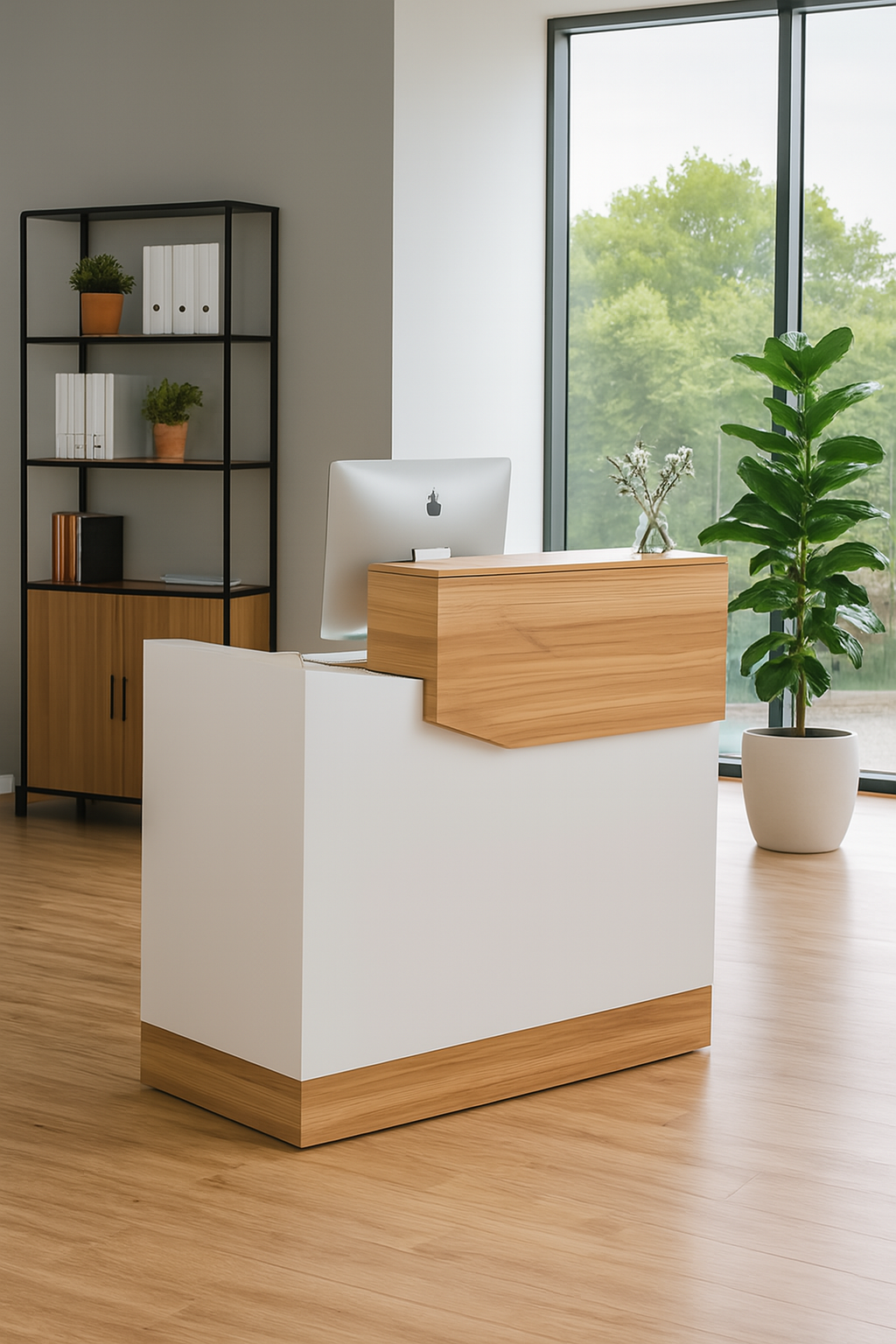 Welcome guests with elegance and confidence. This contemporary reception desk blends crisp white surfaces with warm natural wood accents, creating a refined focal point for any office entrance. Designed for both style and function, it feature