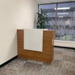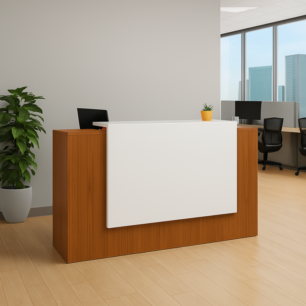 Welcome guests with confidence and style. This modern reception desk blends warm wood tones with a crisp white panel to create a clean, professional aesthetic that suits any office environment—from corporate headquarters to creative studios.