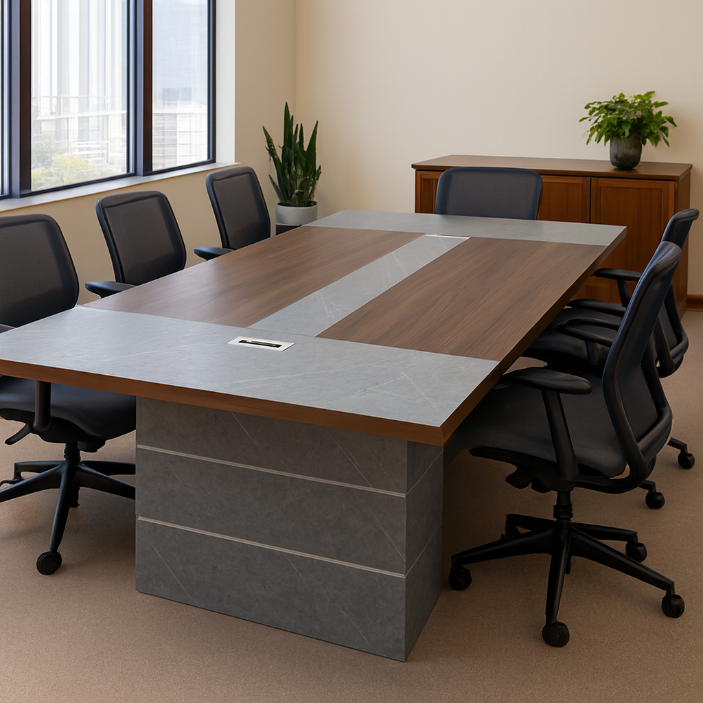 Command attention and foster collaboration with our Executive Conference Table, designed to anchor modern meeting rooms with style and purpose. Featuring a two-tone surfaceโnatural wood bordered by sleek gray accentsโand a central strip for visual symmetry, this table blends functionality with architectural elegance.
