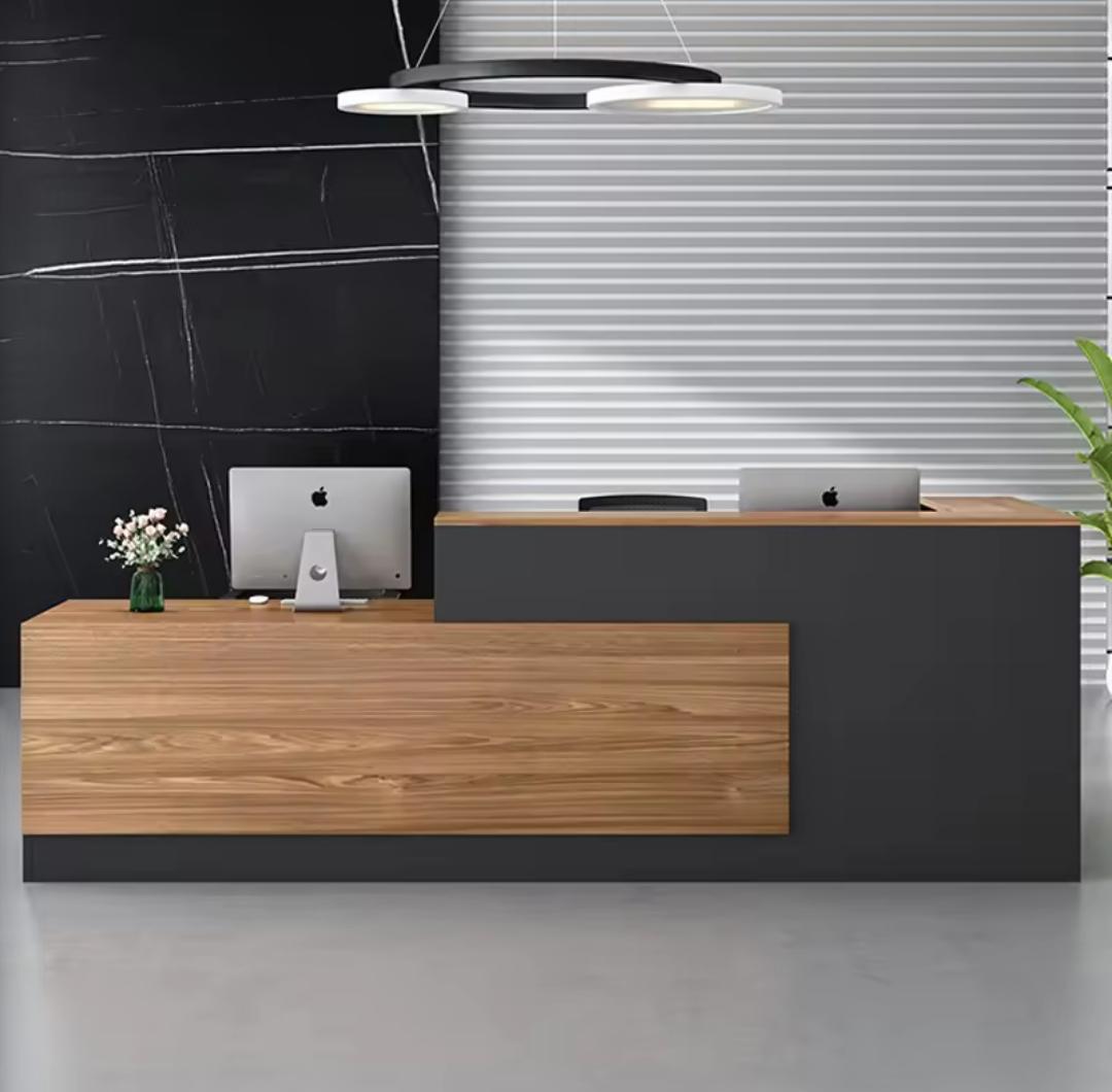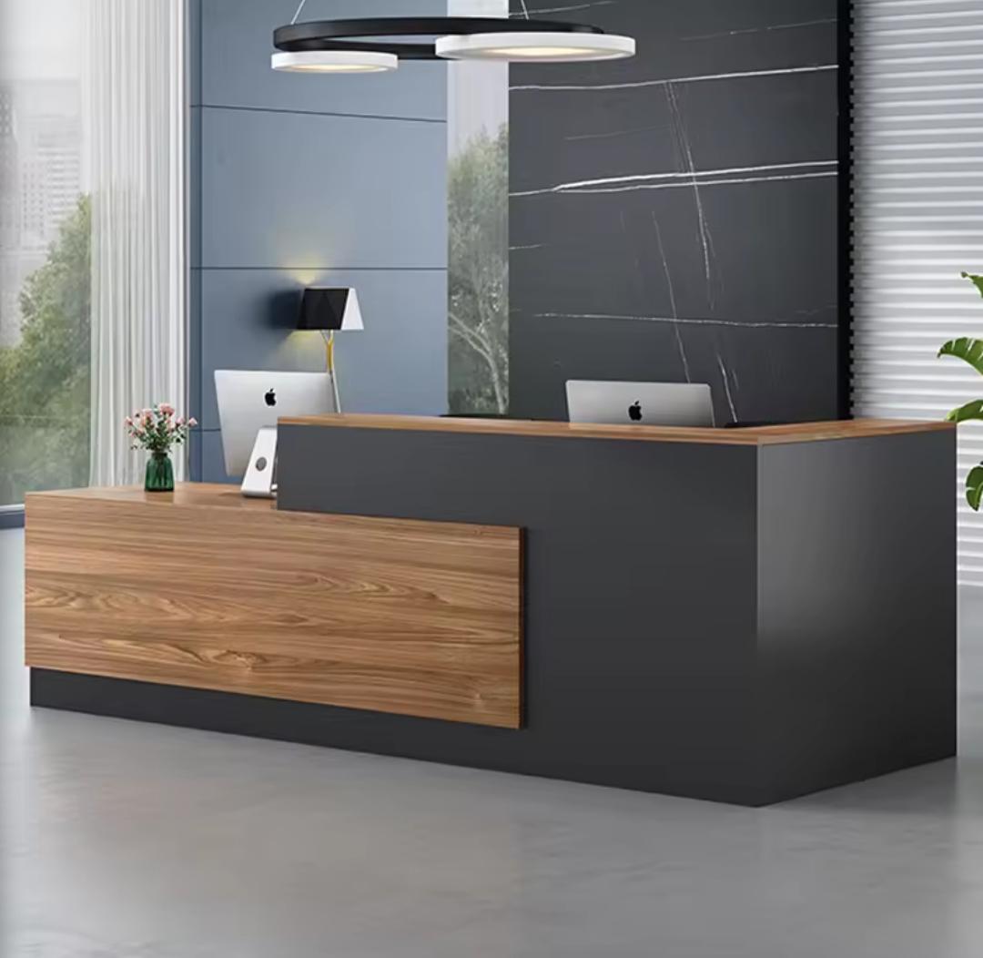 Make an unforgettable first impression with the apex executive reception desk. Combining a sleek charcoal mate finish with premium wood grain accents, this architectural piece brings a sense of authority and warmth to your lobby. Designed for functionality and style, it provides a spacious workspace while maintaining a clean minimalist aesthetic for your front office.