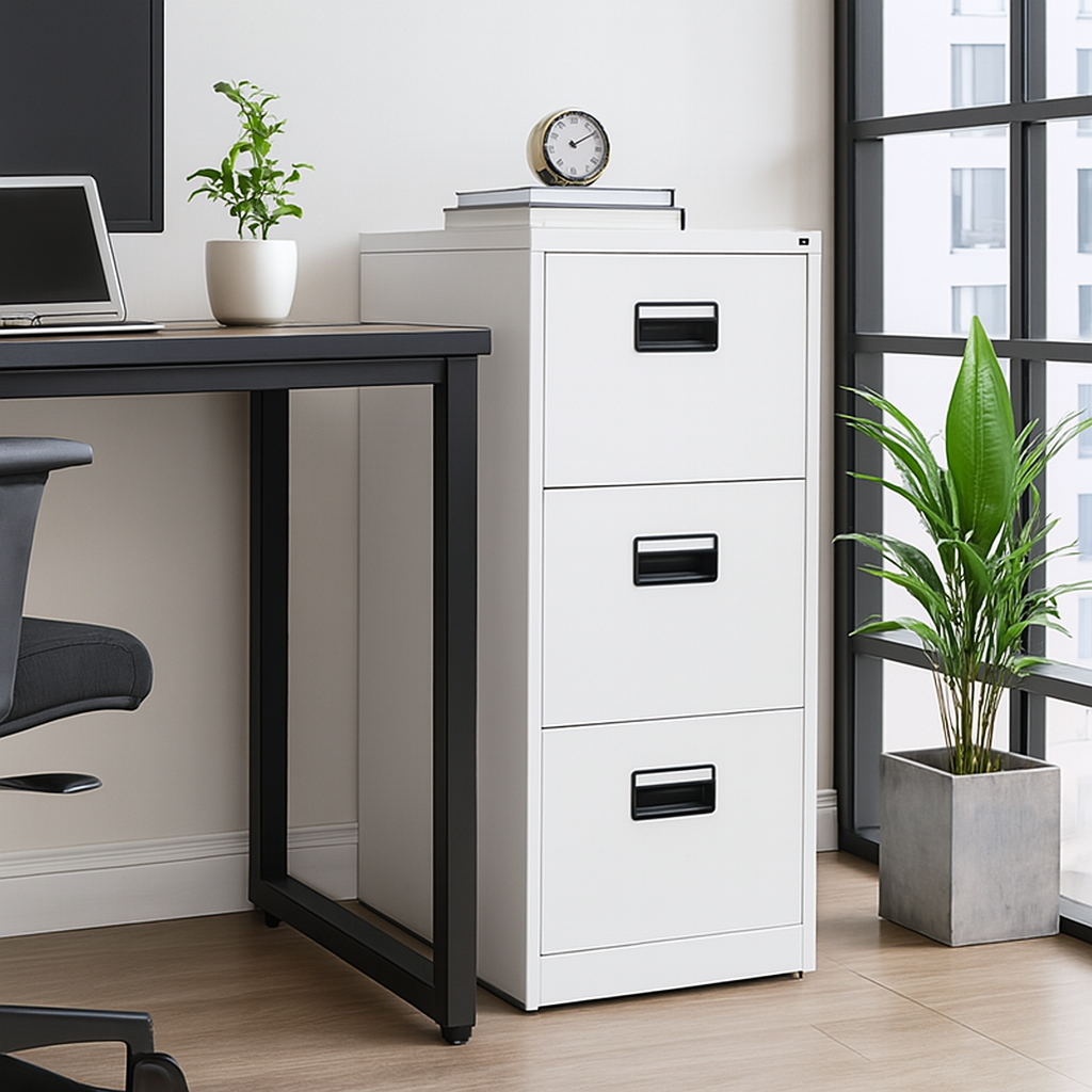 Sleek, functional, and effortlessly refined—this three-drawer white filing cabinet is designed to complement contemporary office environments while keeping your essentials organized and within reach. Its clean lines and minimalist silhouette blend seamlessly beside executive desks or creative workstations, making it a versatile addition to any professional space.