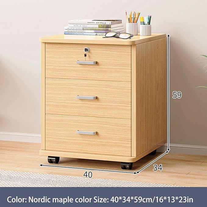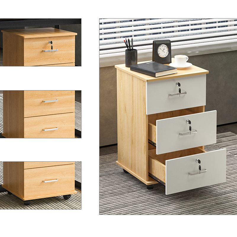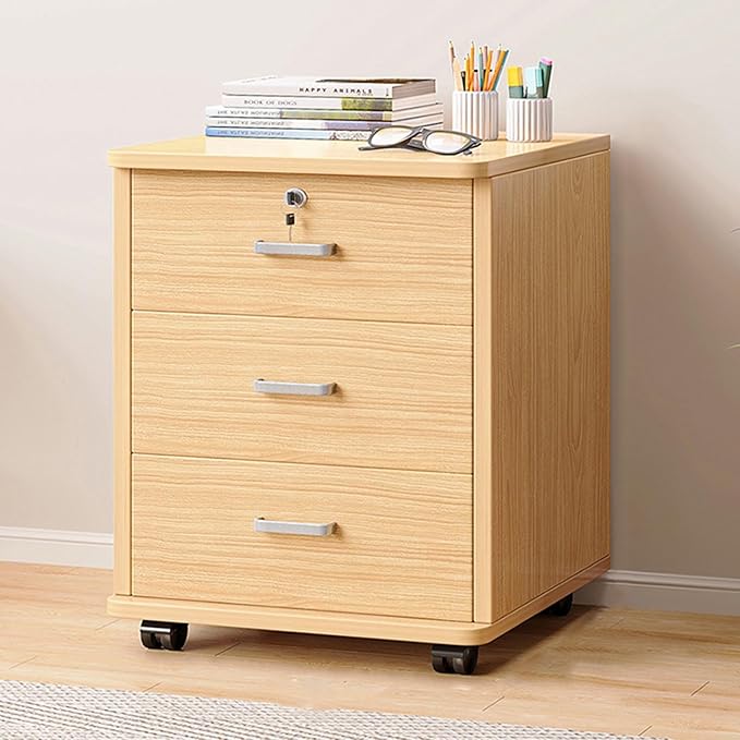 Streamline your workspace with this sleek three-drawer mobile pedestal—designed for modern offices that value both form and function. With a warm wood finish and smooth-rolling caster wheels, this cabinet offers effortless mobility and a polished aesthetic. The top drawer includes a secure lock for confidential documents, while the horizontal metal handles add a contemporary touch.