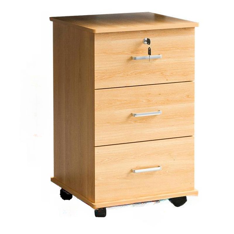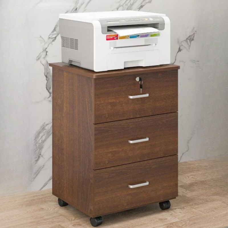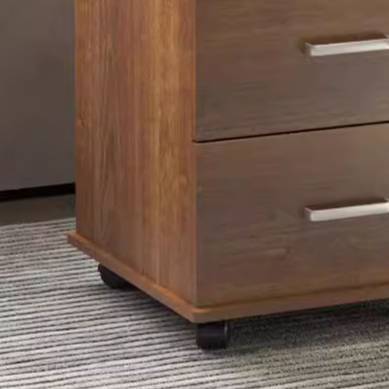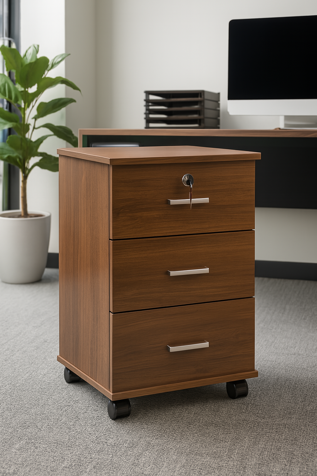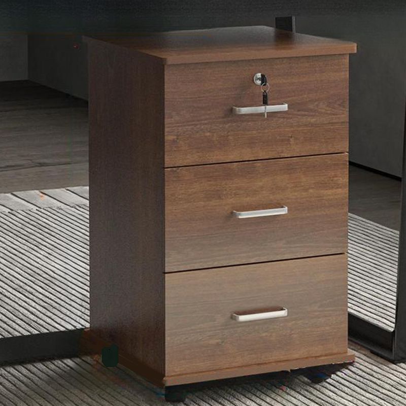 Streamline your workspace with this sleek three-drawer mobile pedestal—designed for modern offices that value both form and function. With a warm wood finish and smooth-rolling caster wheels, this cabinet offers effortless mobility and a polished aesthetic. The top drawer includes a secure lock for confidential documents, while the horizontal metal handles add a contemporary touch.