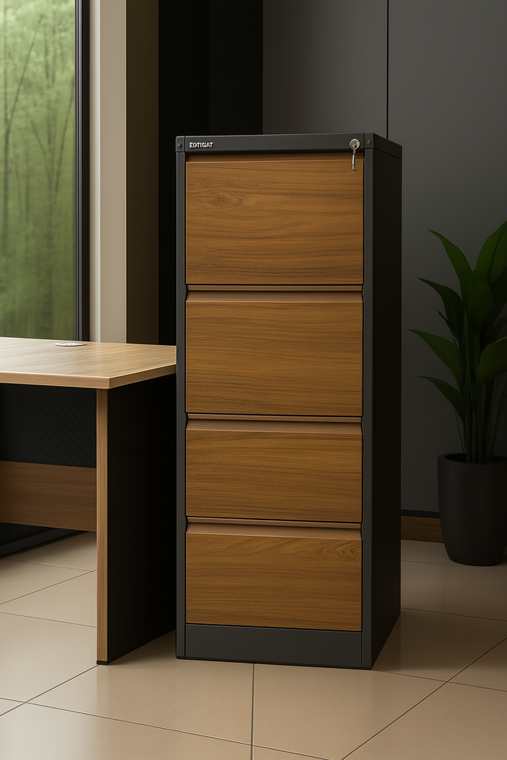 Upgrade your workspace with the BIALKO 4-Drawer Filing Cabinet, a sleek fusion of woodgrain elegance and industrial strength. Designed for professionals who value both aesthetics and organization, this cabinet delivers secure storage with a commanding presence.