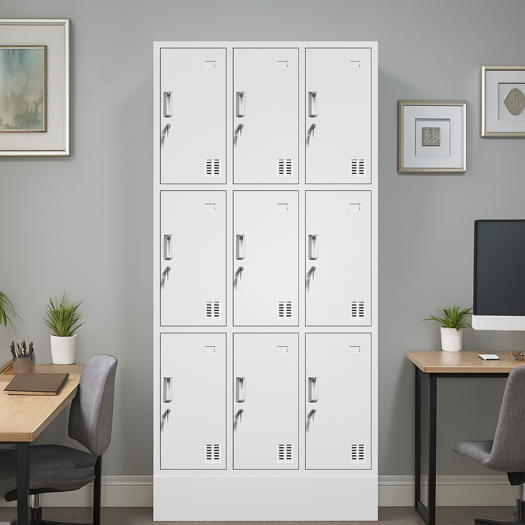 Streamline your workspace with this 9-compartment metal locker, engineered for both style and security. Finished in clean white and framed by a minimalist gray backdrop, this unit blends effortlessly into contemporary office settings—offering a polished solution for personal storage without compromising design