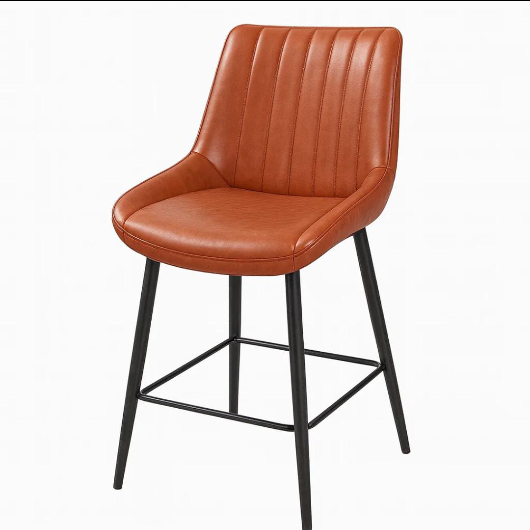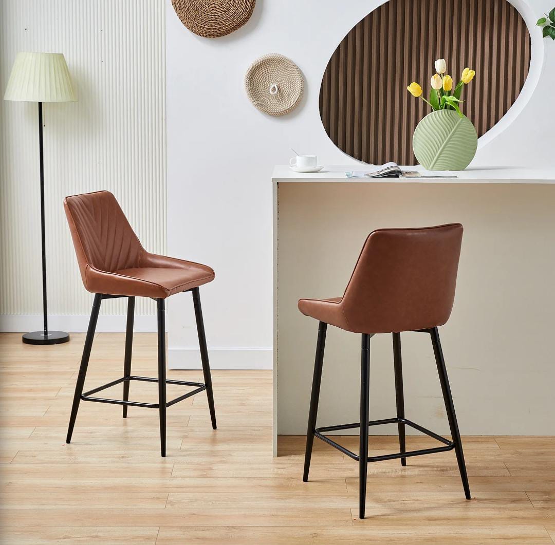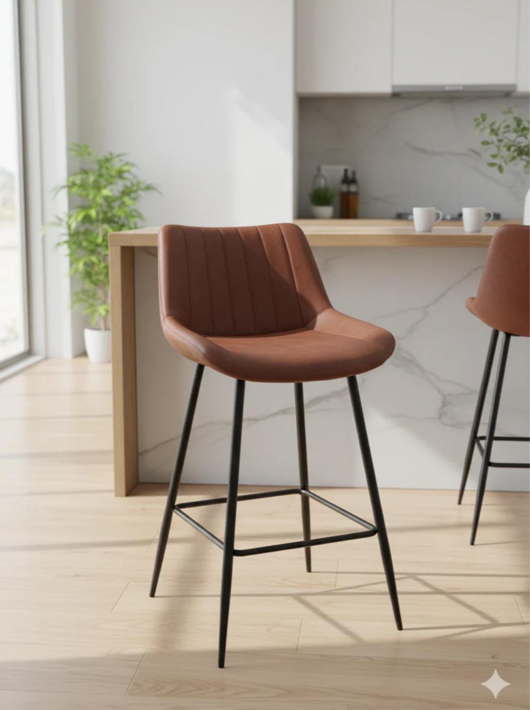 Add a touch of warmth and retro style to your kitchen or bar area with this fixed-height bar stool. Its features a contoured, generously padded seat upholstered in a rich, reddish-brown faux leather or vinyl with vertical channel stitching ensuring both comfort and durability. The seat is supported by a sturdy black metal frame with an integrated footrest, offering stable and fashionable seating for everyday use.