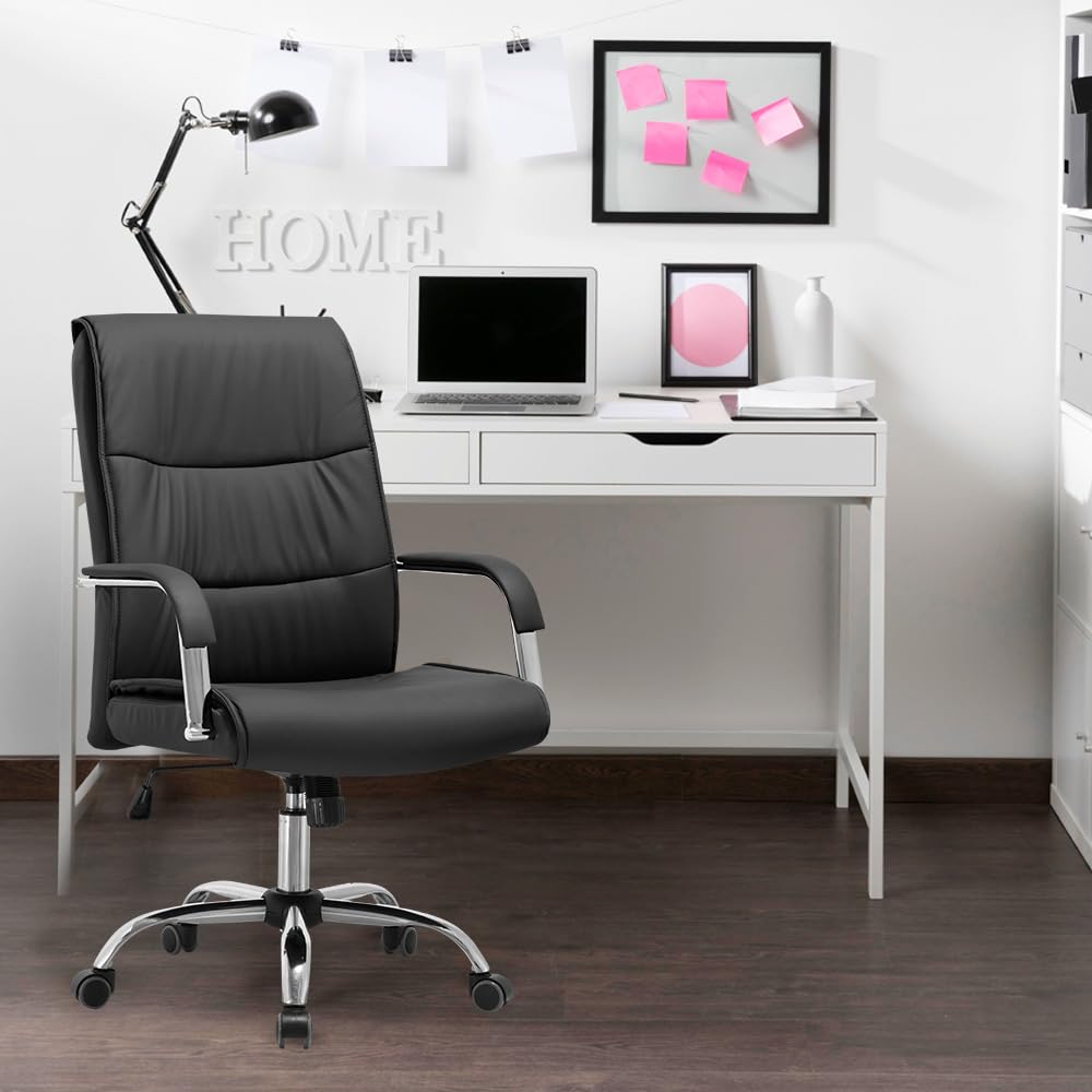 Command attention and comfort with this premium black leather office chair—designed for leaders who value both style and substance. Featuring a high backrest with refined horizontal stitching, plush cushioning, and chrome-accented armrests, this chair blends modern elegance with ergonomic support. The five-star chrome base and smooth-rolling casters ensure effortless mobility, while the sleek silhouette complements any professional setting—from minimalist startups to luxury executive suites.