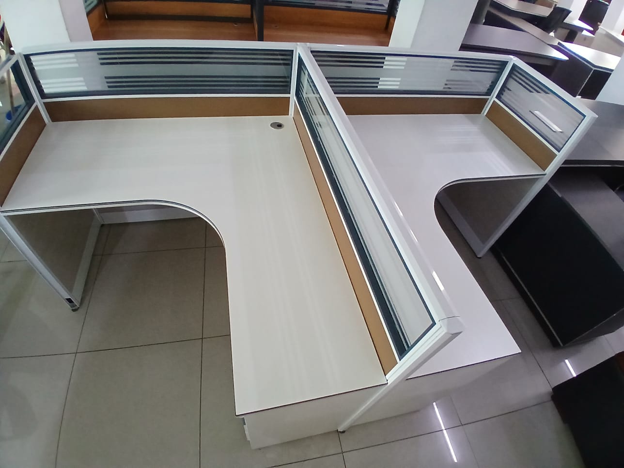 • Semi-Private Partitioning – Stylish metal-framed panels with transparent and opaque sections provide visual separation without isolation.