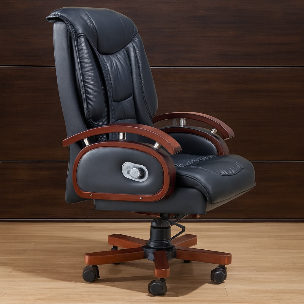 Elevate your workspace with this executive black leather office chair—where timeless craftsmanship meets modern prestige. Wrapped in supple leather and anchored by a rich wooden base, this chair is more than seating—it’s a statement