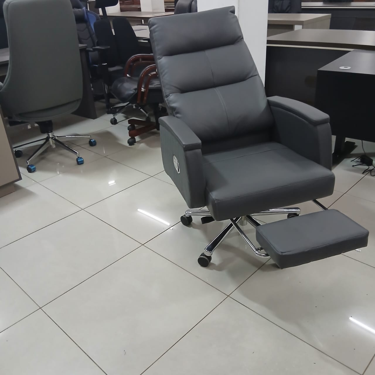 Command your workspace with confidence. Our high-back black leather executive chair is designed for professionals who demand both style and support. Featuring plush cushioning, padded armrests, and a matching footrest, this chair delivers all-day comfort without compromising on aesthetics.