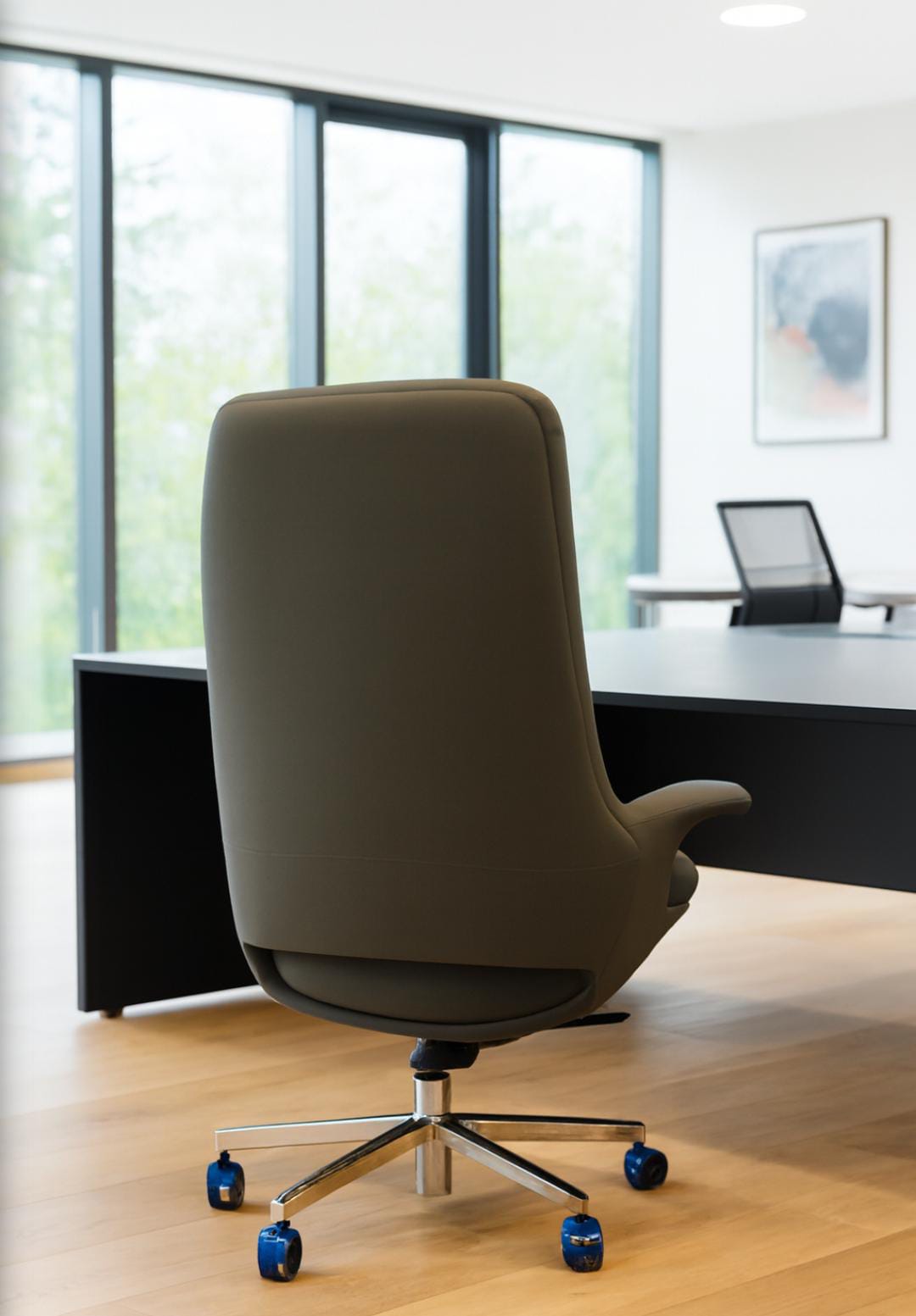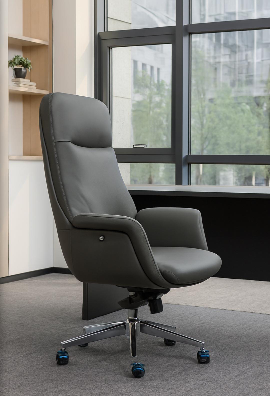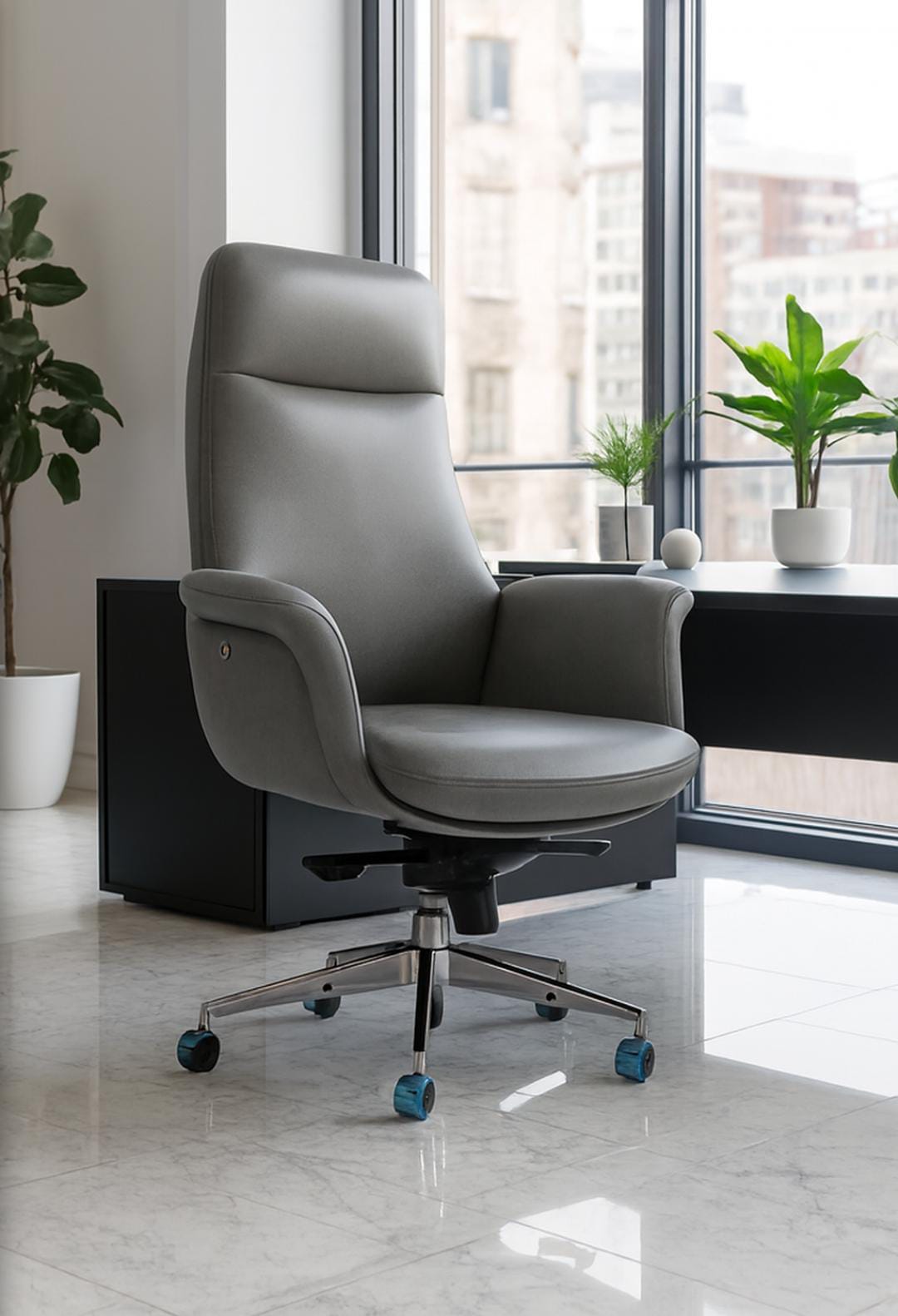 Elevates your workspace with this executive high-back office chair, designed for both comfort and sophistication .Upholstered in sleek gray leatherette , the chair features a contoured backrest, offering full spinal support for long hours of productivity. The padded armrests provide ergonomic relief, while the swivel base ensures seamless mobility across tasks. The chair stands on a five -point steel base, each leg fitted with vibrant caster wheels that add a subtle pop of color and modern flair, Its sturdy construction and refined silhouette make it ideal for executive offices, boardrooms, or stylish home workspaces.
