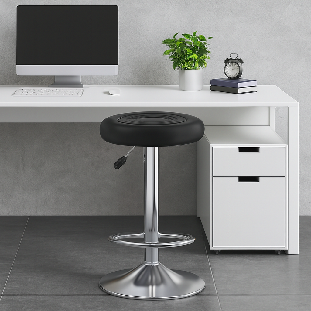 Designed for modern professionals who value both style and function, this adjustable-height stool blends effortlessly into minimalist and executive office environments. Its chrome base adds a touch of sophistication, while the black cushioned seat delivers ergonomic comfort for long hours of focused work or quick collaborative sessions.