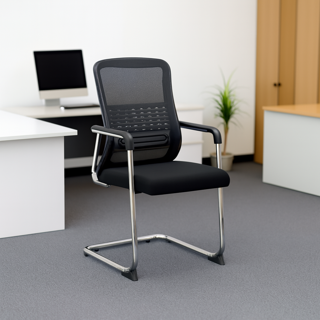 Designed to welcome with style and support, this black mesh-back visitor chair blends modern elegance with ergonomic comfort. Its chrome cantilever frame offers a clean, architectural silhouette, while the padded seat and armrests ensure a relaxed experience for guests, clients, or collaborators. The breathable mesh back adds a contemporary touch and keeps things cool—literally and visually. Whether placed in a reception area, meeting room, or executive office, this chair signals that your space is as thoughtful as it is functional