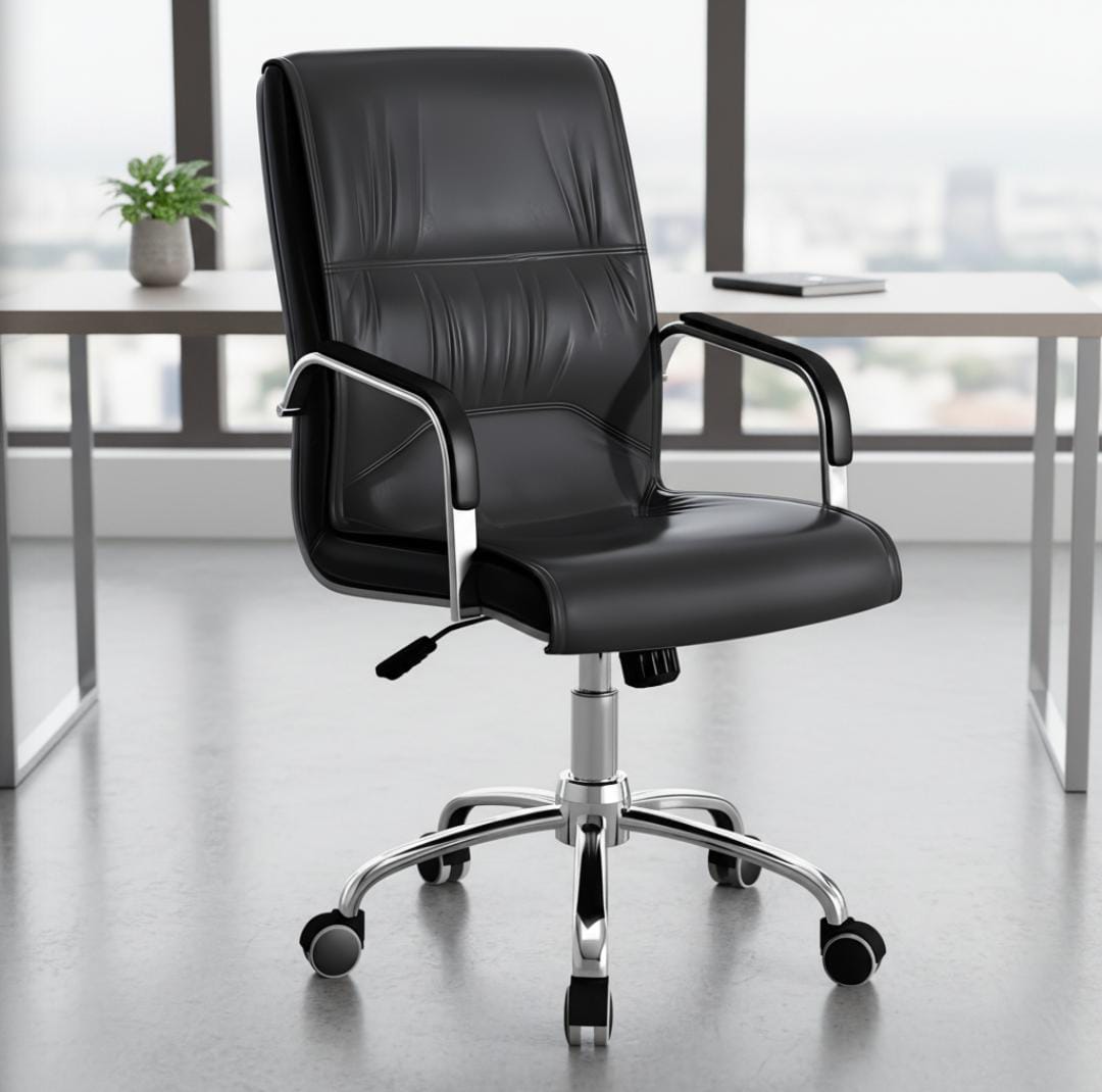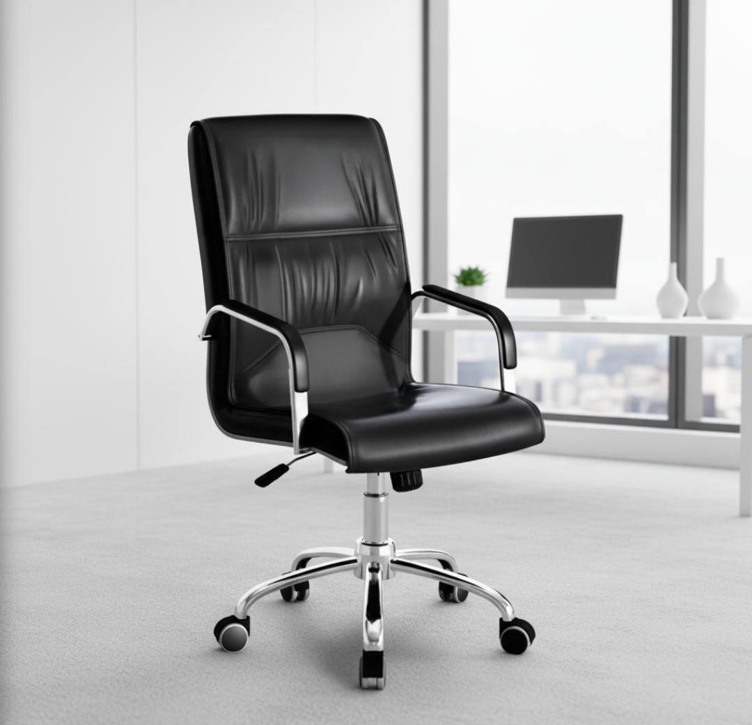 Upgrade your professional sanctuary with a chair that embodies modern efficiency . The pro-streamline executive swivel chair is designed for the high -impact professional who requires a clean, architectural look without compromising on the ergonomic support needed for long days at the desk .With its sleek black upholstery and high luster chrome accents, this chair serves as the perfect minimalist centerpiece glass offices or streamlined home workspaces.