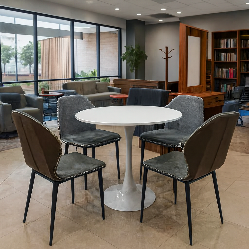 Welcome to the perfect blend of relaxation and sophistication. Our contemporary lounge setup features a round white table surrounded by plush upholstered chairs in warm gray and brown tones — ideal for informal meetings, client waiting areas, or collaborative breakout zones.