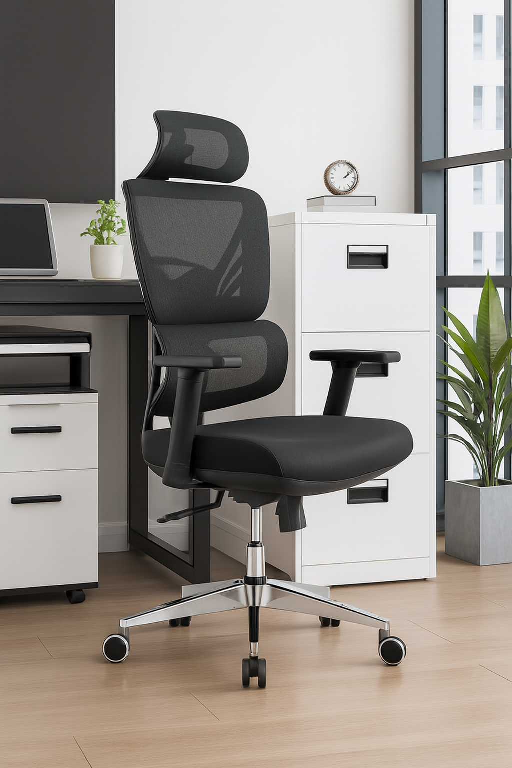 Designed for professionals who demand both style and support, this high-back ergonomic office chair delivers all-day comfort without compromising on aesthetics. With breathable mesh, a contoured headrest, and adjustable armrests, it’s engineered to elevate posture and productivity in any workspace