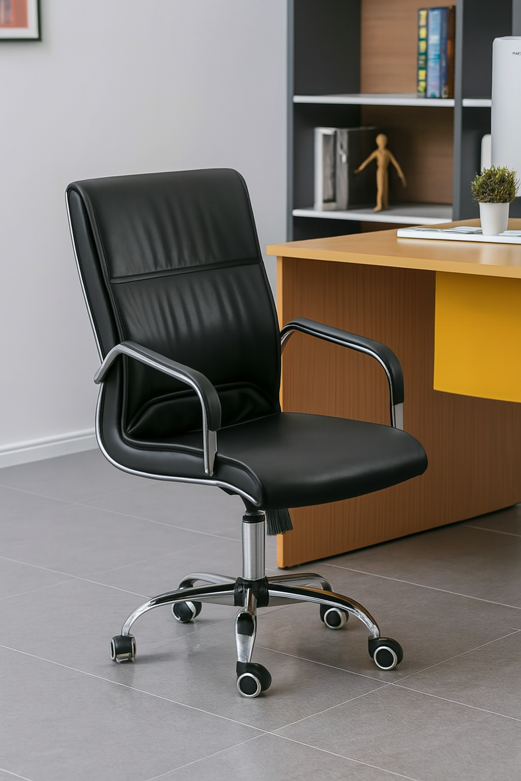 Elevate your workspace with this streamlined black executive chair, designed for both comfort and authority. Featuring a high backrest, contoured cushioning, and supportive armrests, it delivers ergonomic ease without compromising on style. The chrome base and smooth-rolling casters add a touch of modern polish, making it ideal for dynamic professionals who value mobility and presence.