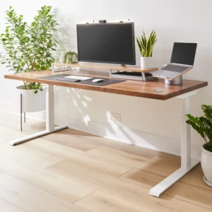 Step into a workspace that adapts to you. This sleek sit-stand desk features a warm wooden top paired with minimalist white legs, offering both style and substance for today’s dynamic professionals. Whether you’re powering through spreadsheets or leading virtual meetings, this desk keeps pace with your productivity